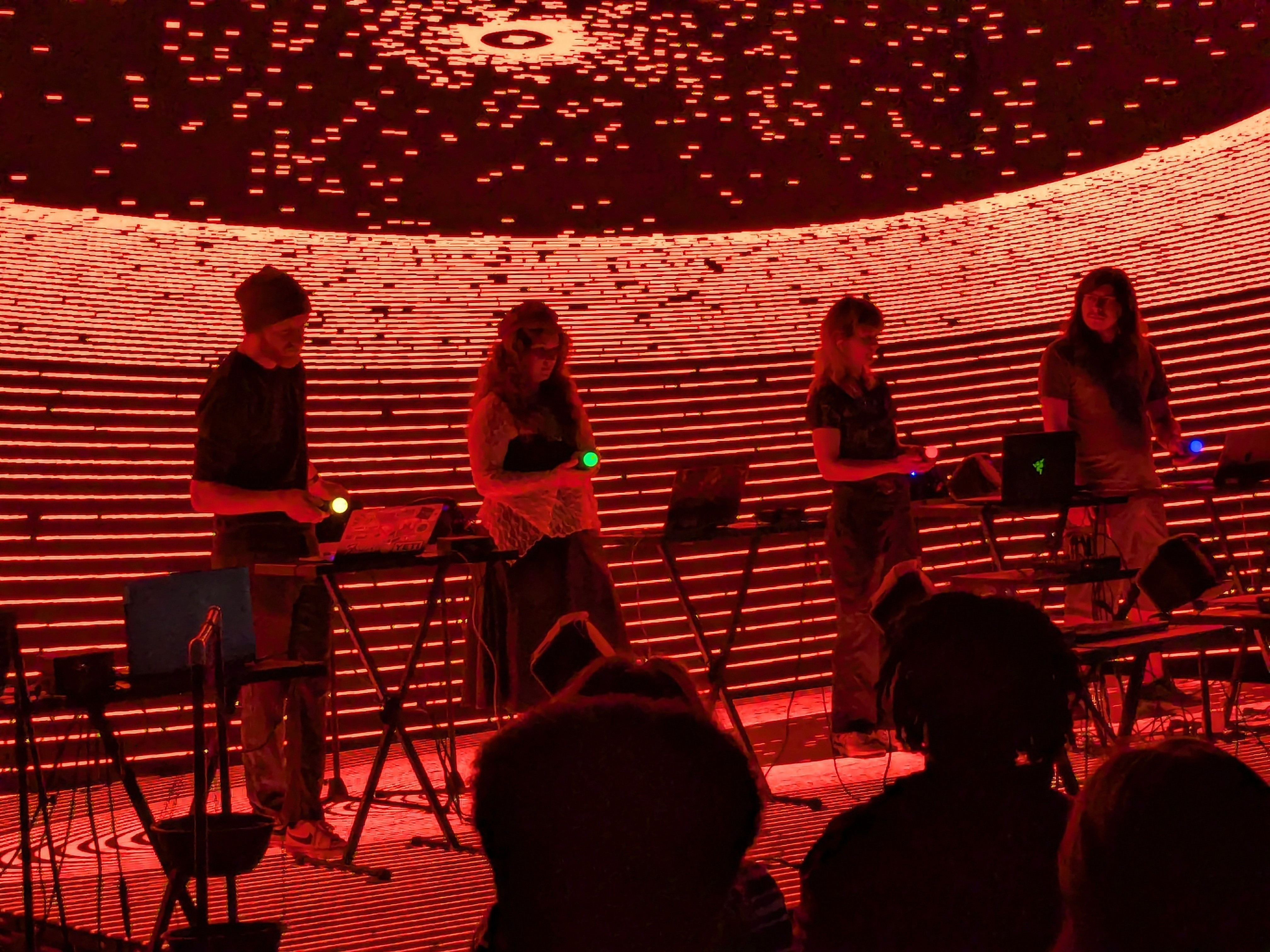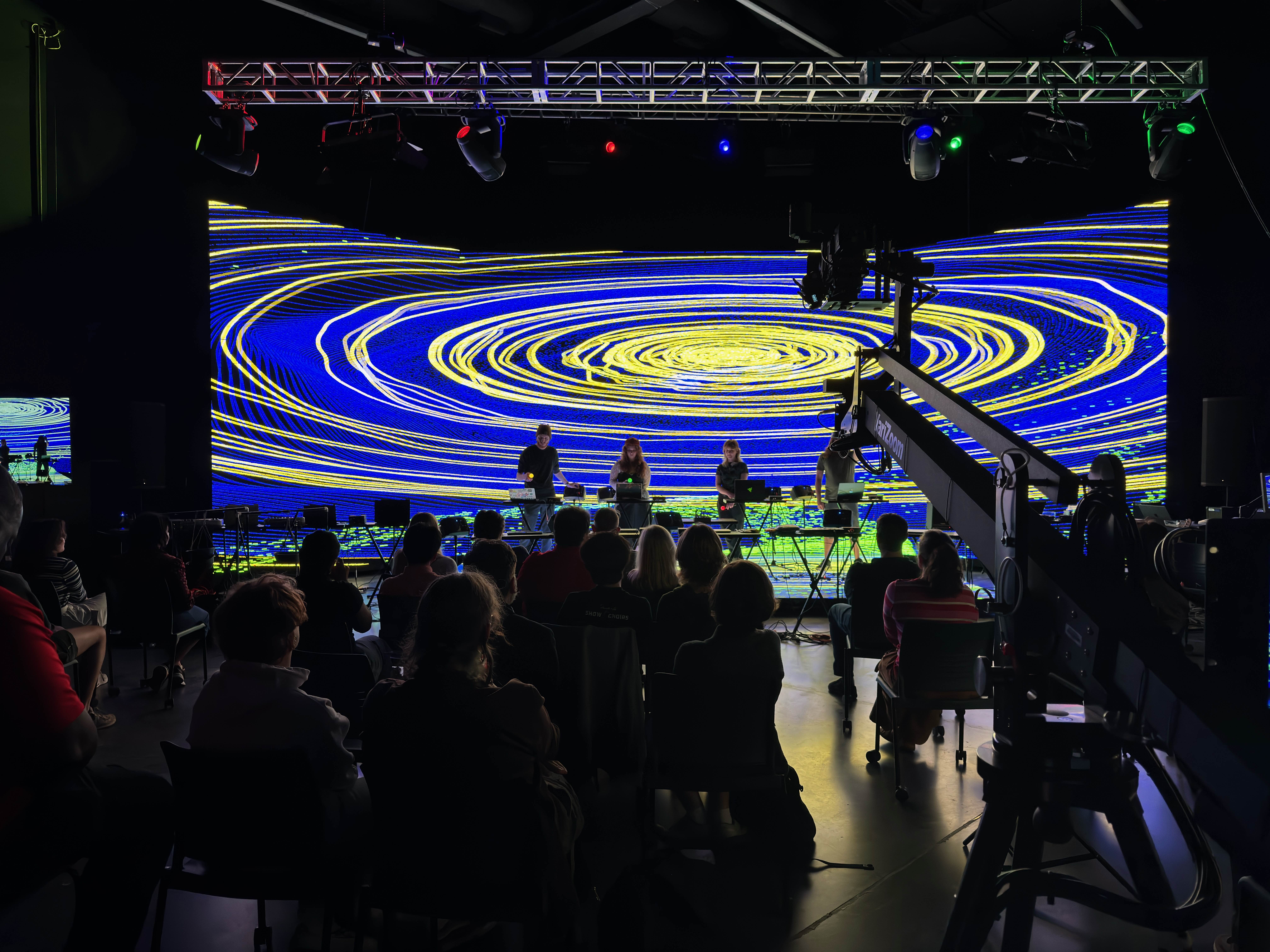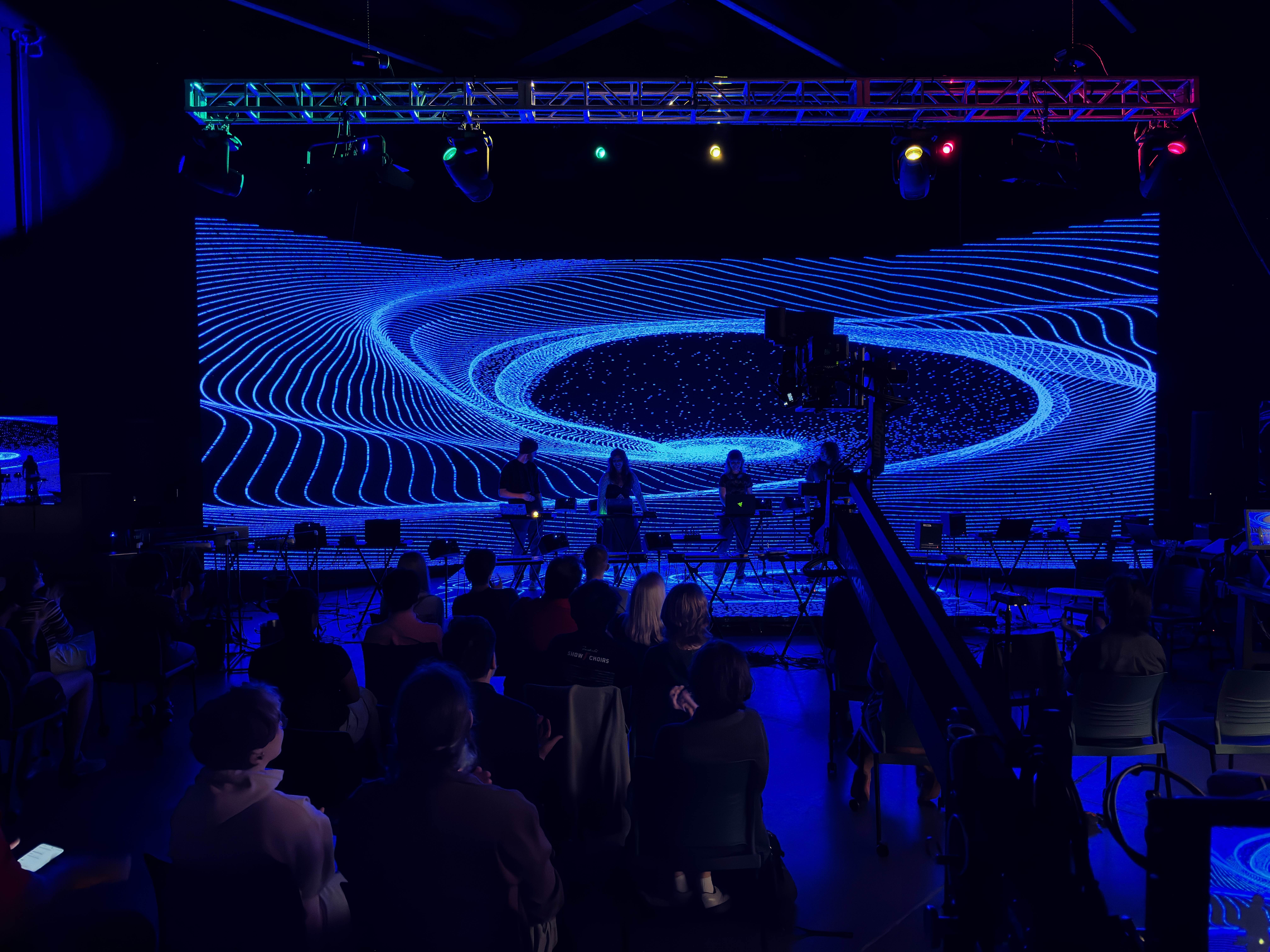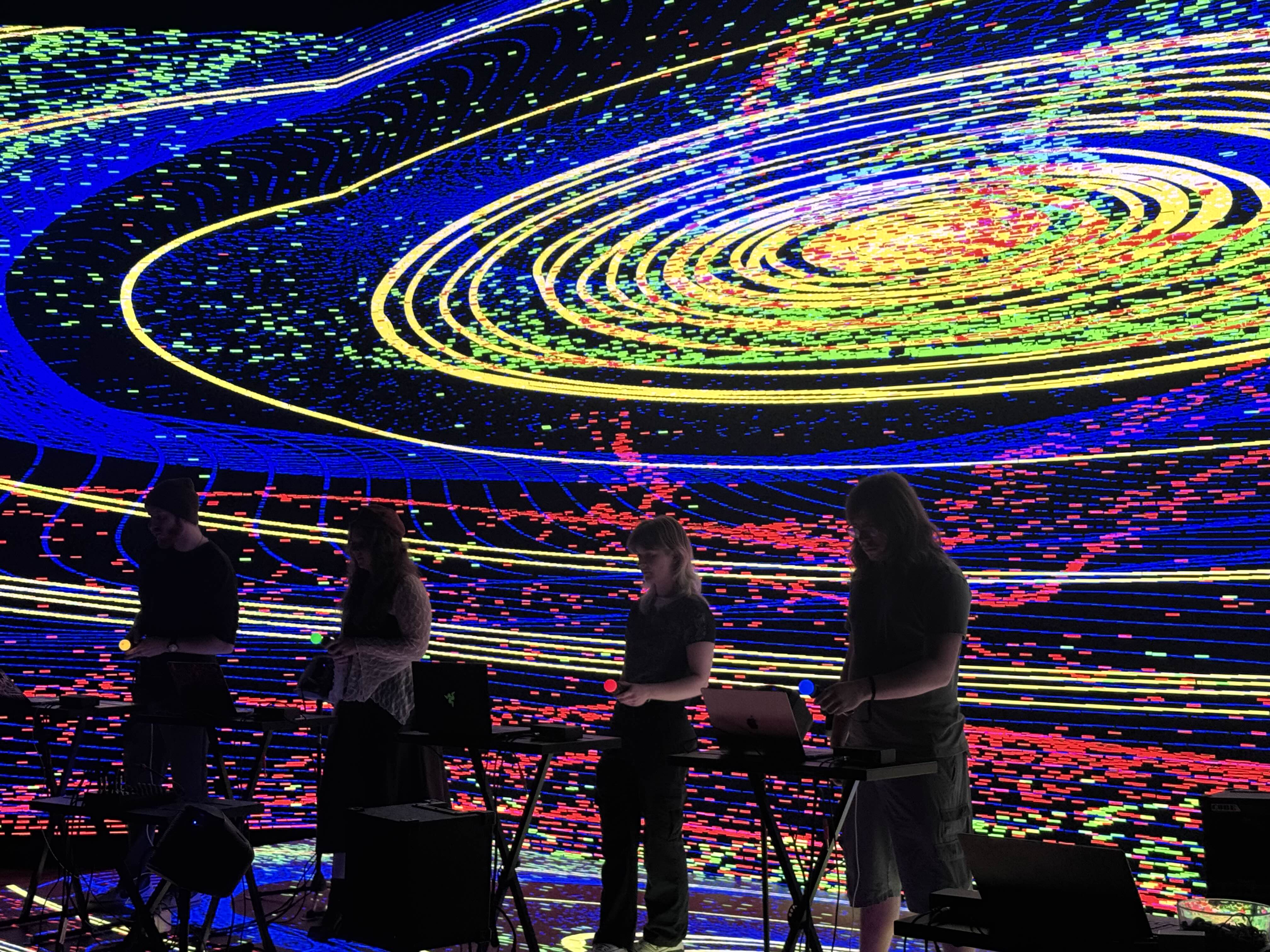 For Miami University's Laptop Ensemble, I built a custom performance system using PlayStation Move controllers as motion-based instruments. I programmed the controllers to connect over Bluetooth and wrote a Python script to collect their sensor data and broadcast it across the network to multiple laptops running a custom Max patch built by a team member. The patch interpreted the motion data, generated sound, and analyzed frequency content which was sent to my TouchDesigner setup to drive audio-reactive visuals that responded to each performer and their assigned color.